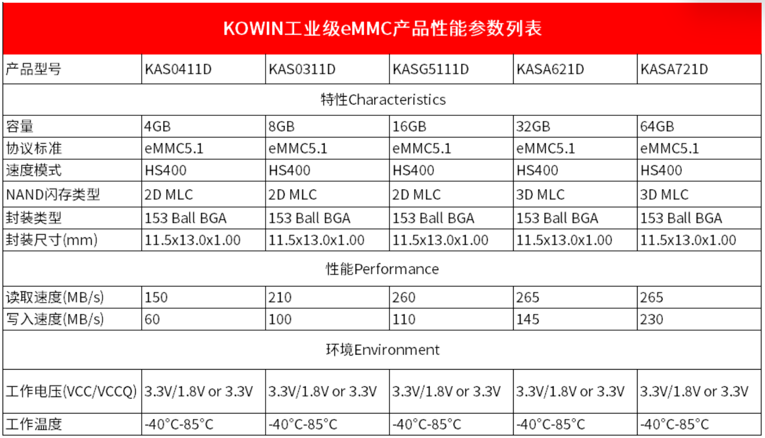KOWIN工业级eMMC产品参数