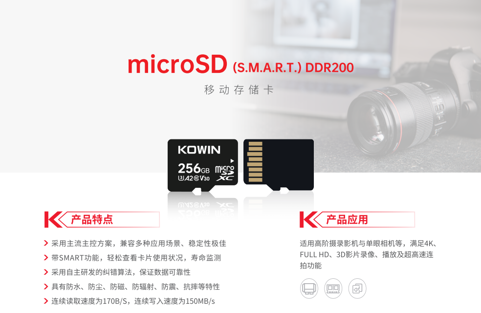 KOWIN microSD 卡支持 4GB-512GB 容量扩展,具有防水、防尘、防磁、防辐射、防震、防摔等特性,产品读写速度高达170MB/s、160MB/s,工作温度支持- 25℃至 85℃,故障率低,带S.M.A.R.T功能的mircoSD卡还能查看卡片使用情况,实时监测寿命。消费级设备选U3/V30 等级卡可满足1080P 和基础AI等功能,工业环境应对复杂环境可选用工业级宽温卡,适配家用安防、AI 开发套件(如 UnitV-M12)、无网监控摄像头等应用场景。